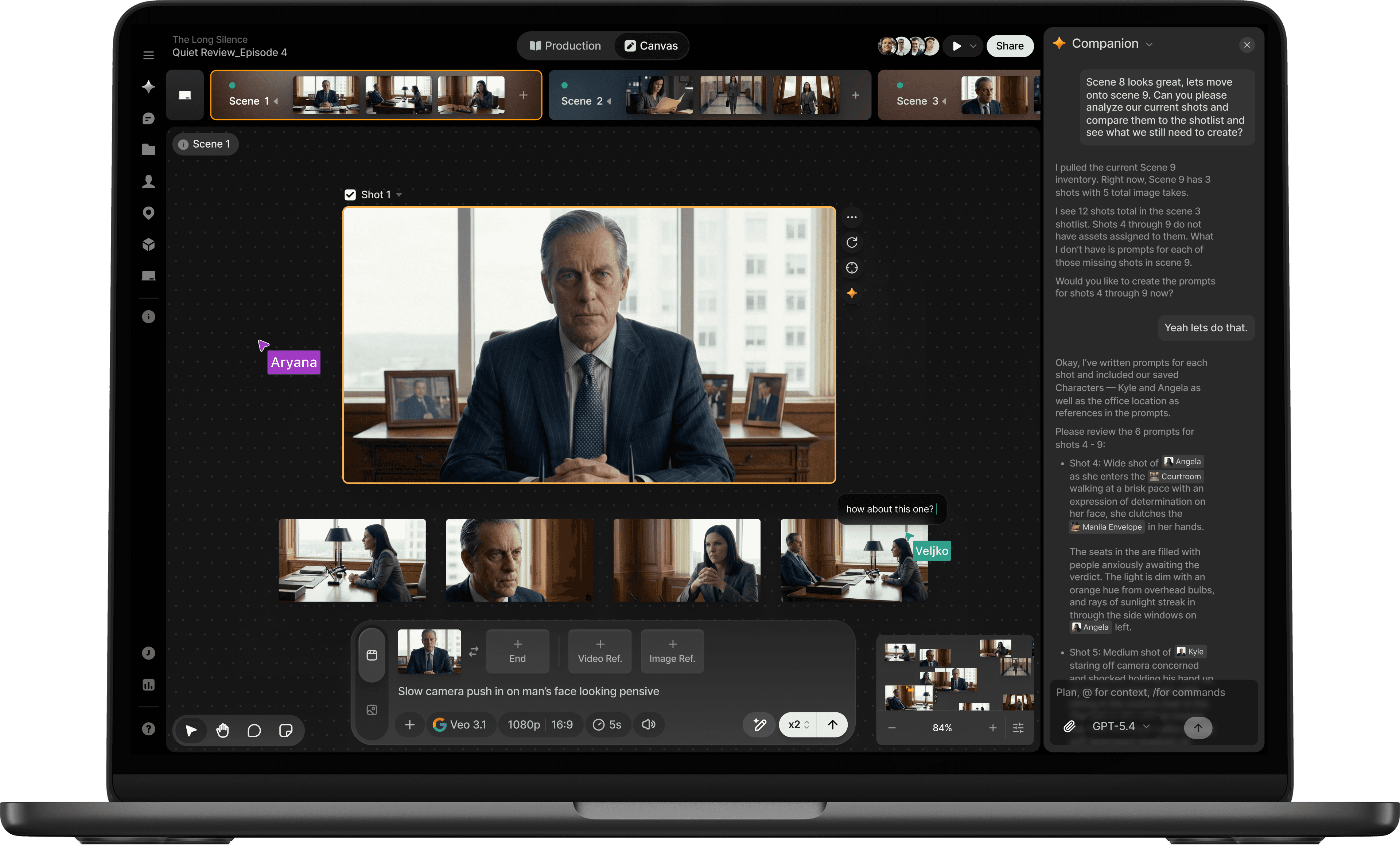 One workspace to generate, storyboard, and direct. Move from the chaos of discovery to final cut without breaking the flow.