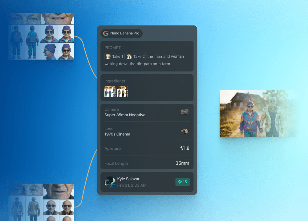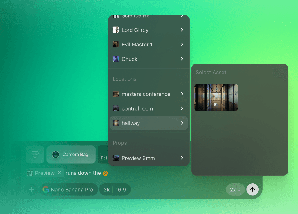 Call on saved assets in your prompt using @ for easy and reliable consistency.