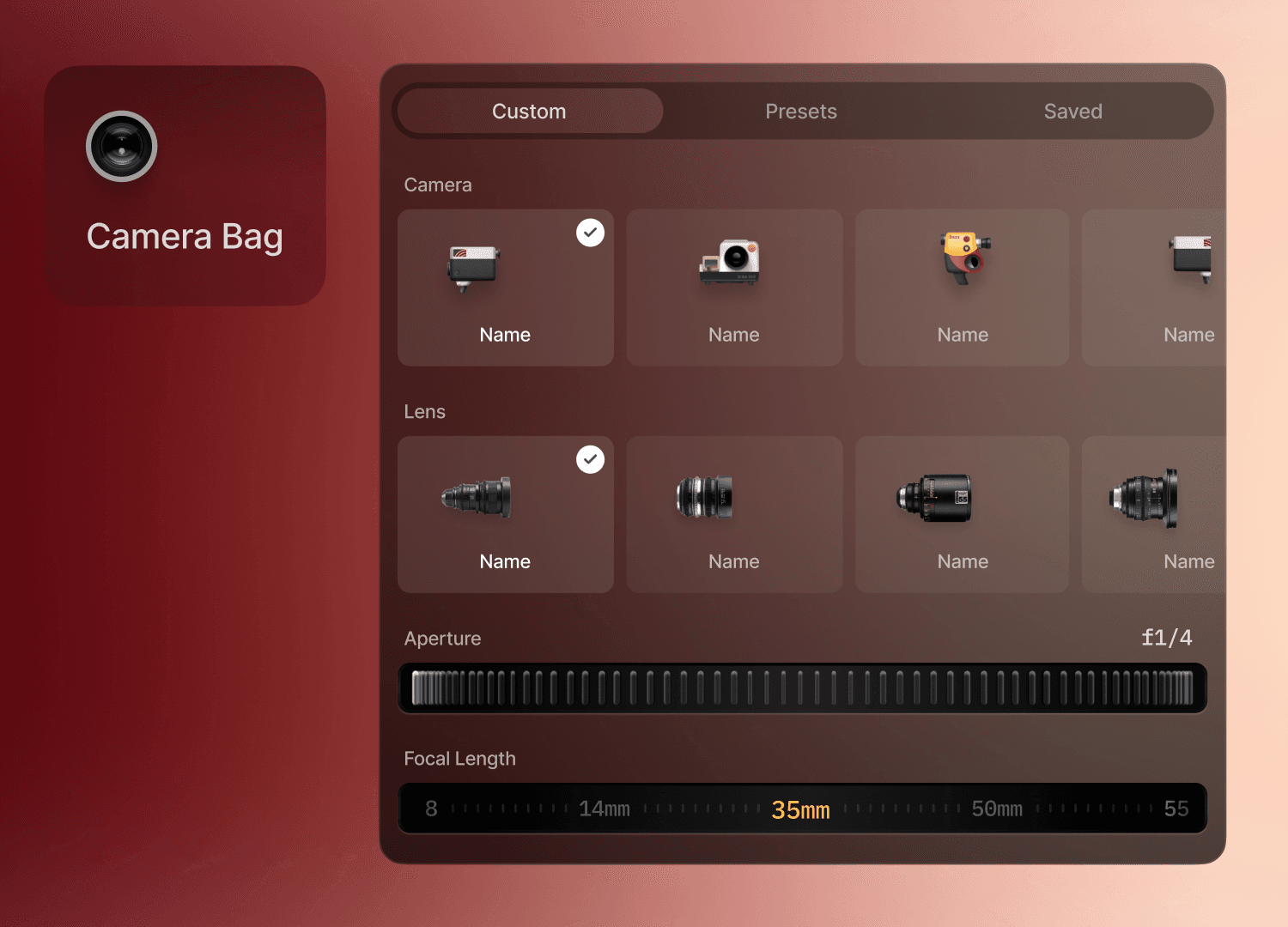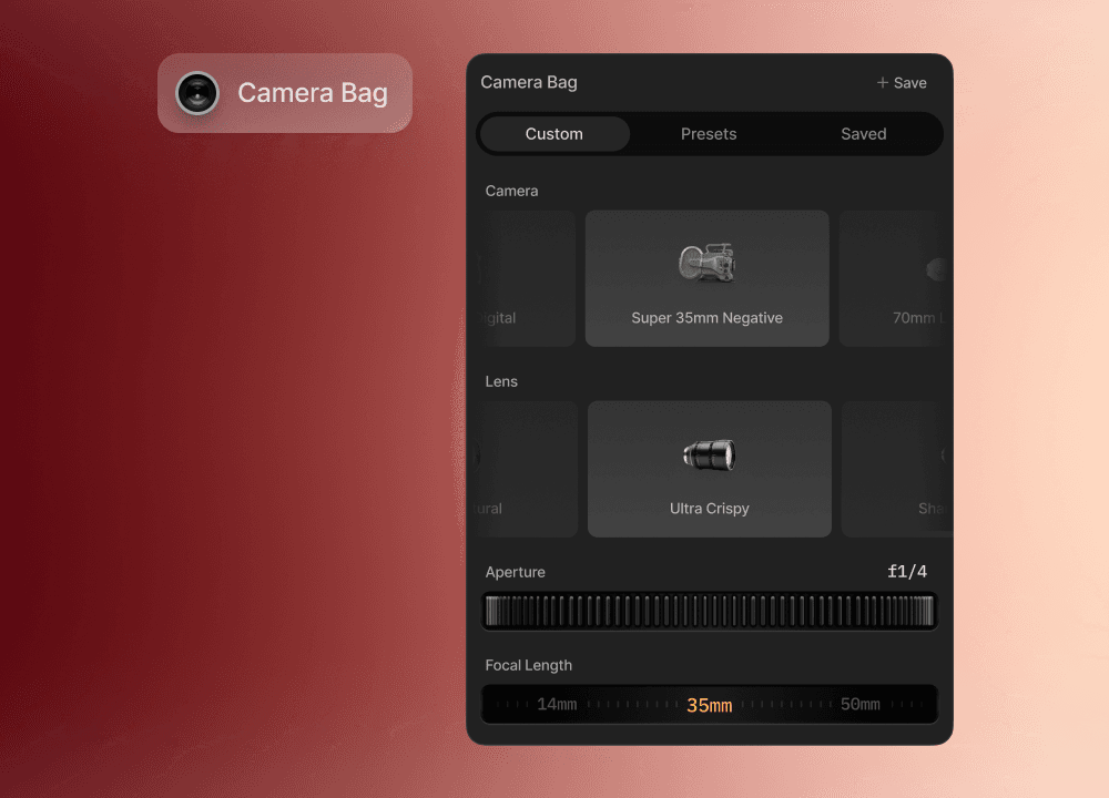 The Camera Bag lets you combine lenses, cameras, film stock and more to define a consistent look.
